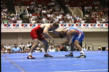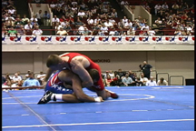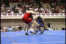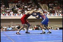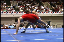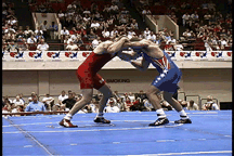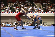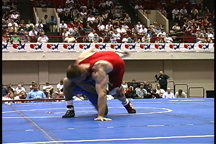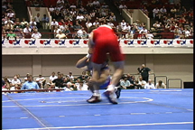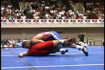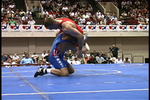 Here, the opponent has sprawled on the blue wrestler.