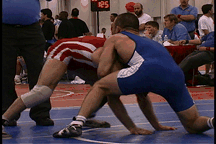 Once the weight of the chest-lock is cleared the red wrestler turns the corner for the score.